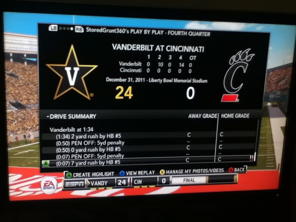 Late to post the results of this one and the game is already over. Yeah, Vandy was in control pretty much this entire game. It seemed that they could have actually won the real life counterpart, but Cincinnati came out on top in overtime. The last bowl of the day is lacking a scoreboard...my iPod's battery died and I forgot I have an actual camera to use...yeah I know fail on my part. Either way Auburn should hopefully beat Virginia. Before I leave you for the night (and year technically) I shall update my tally. After the first four games of the day I am sitting at 11-9. All I care is that Illinois won their game. If I remember after the Auburn/Virginia game is over I might come back and do a quick edit to the tally.